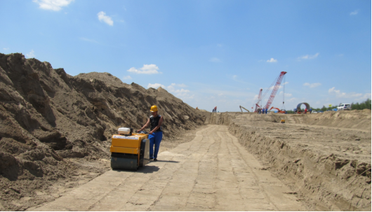 施工人员正在进行沟槽夯直作业